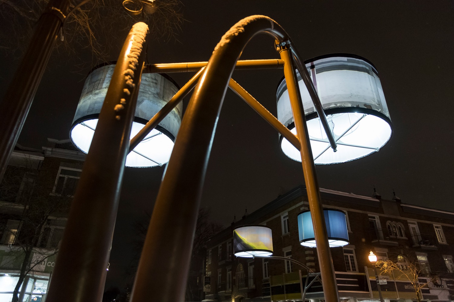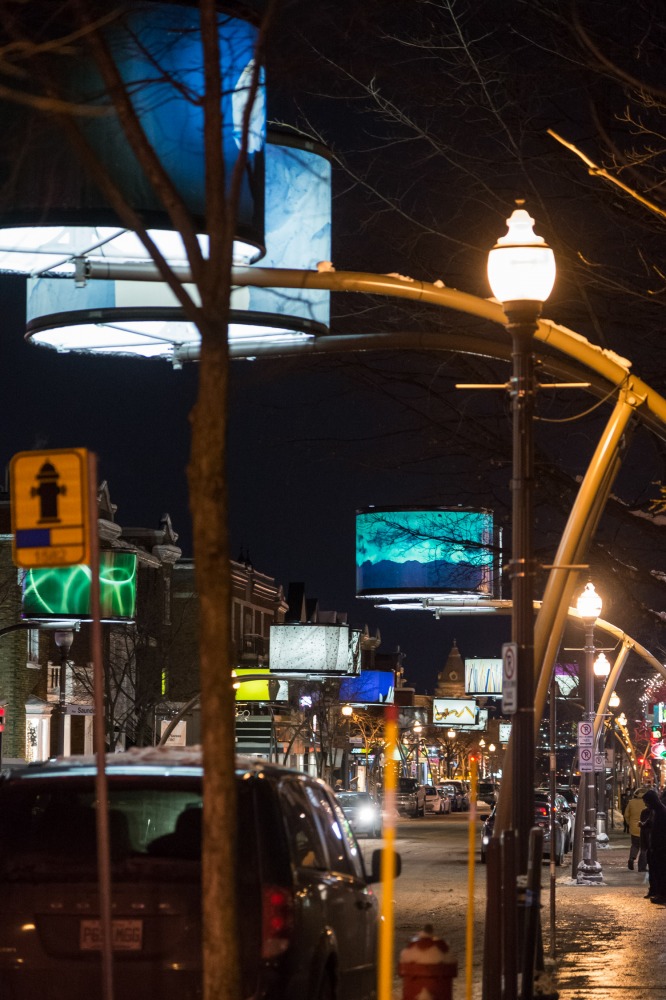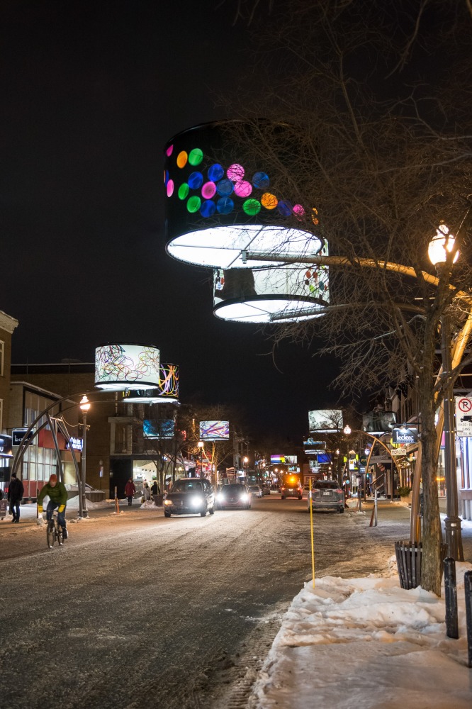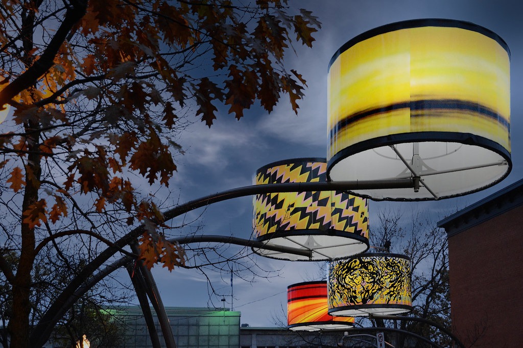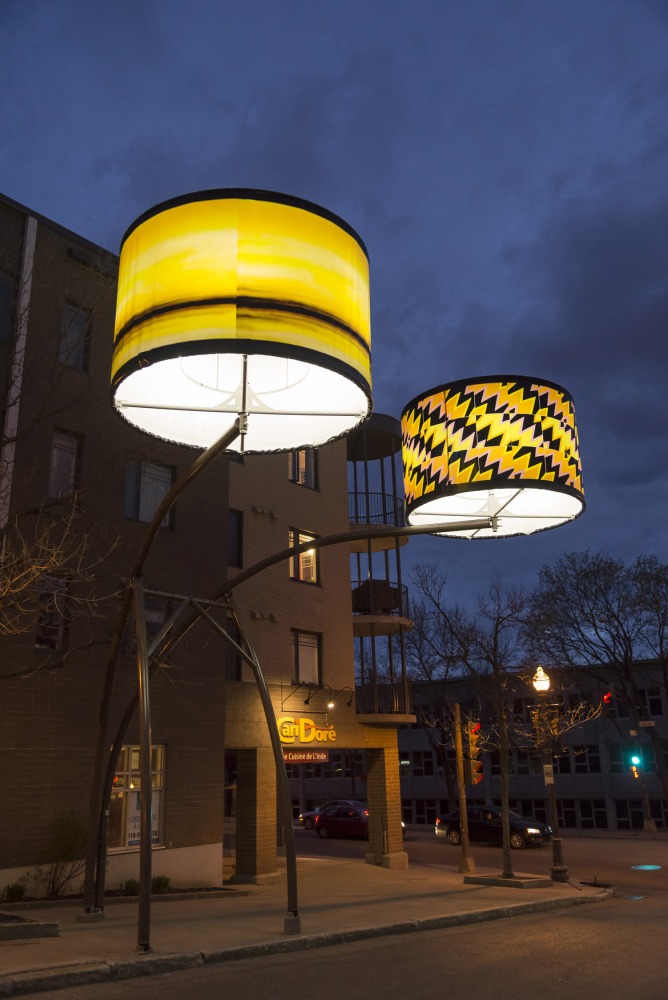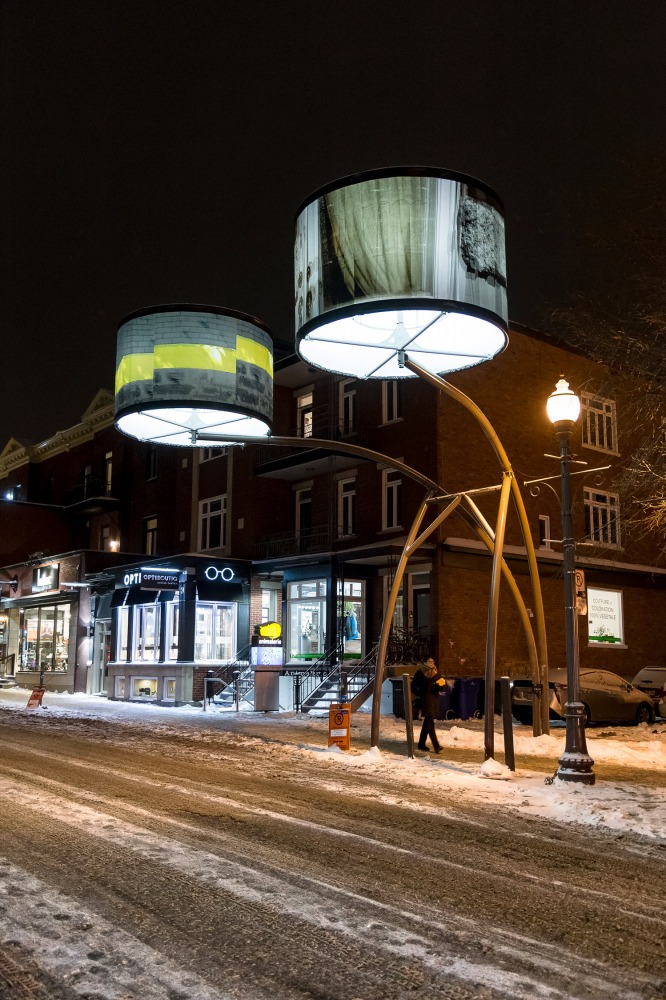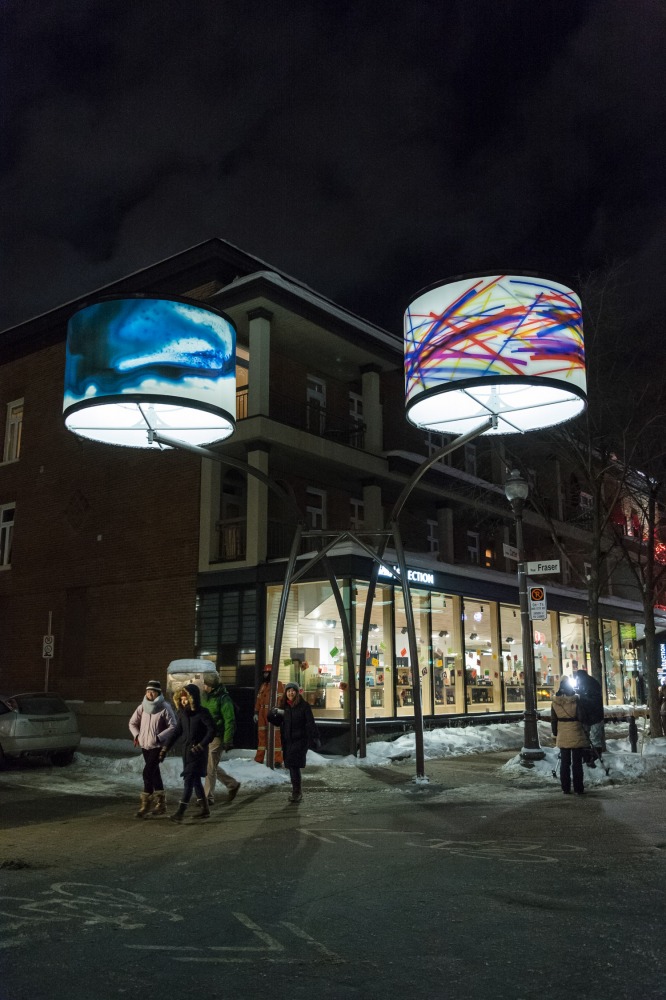 Manon de Pauw, professeure à l’école des arts visuels et médiatiques, signe l’édition 2018-2019 de Lumière sur l’art en créant 34 œuvres inédites pour l’occasion. L’artiste s’est amusée avec ce concept unique plus grand que nature : «J’ai abordé Lumière sur l’art comme un jeu sur la lumière, la matière, la forme et la couleur, une exploration sur la temporalité et la circularité des images, toujours en considérant le point de vue des passants, explique-t-elle. Les abat-jours sont à la fois des objets utilitaires et des supports artistiques, allumés le soir et éteints le jour. Ces dualités m’ont interpellée dans ma manière de concevoir le parcours.»