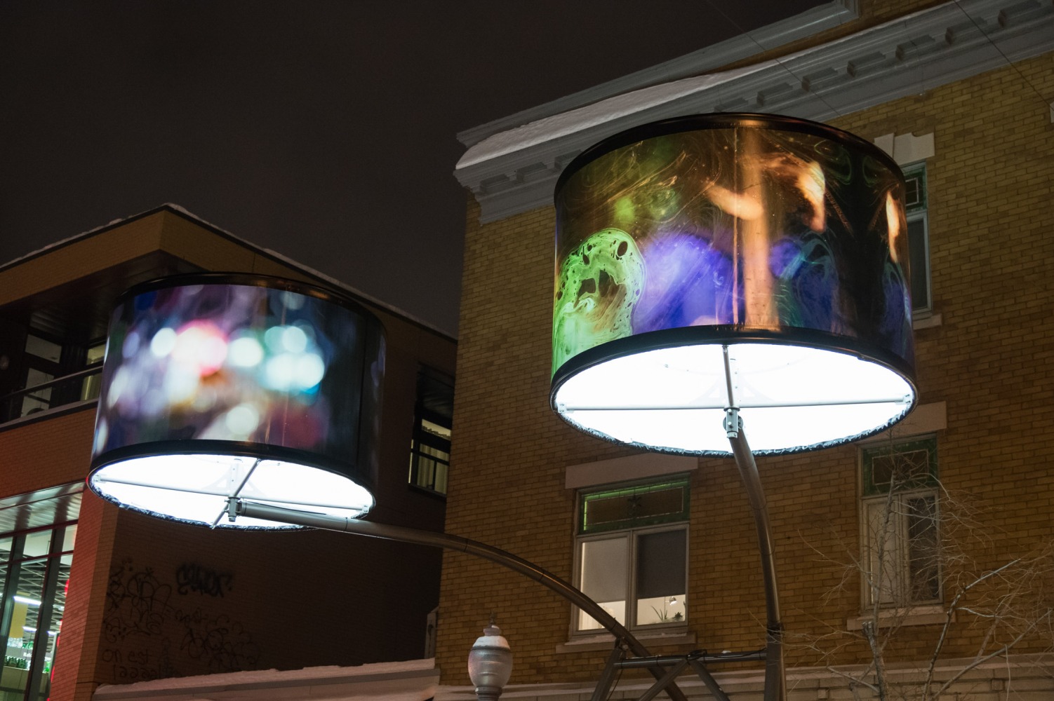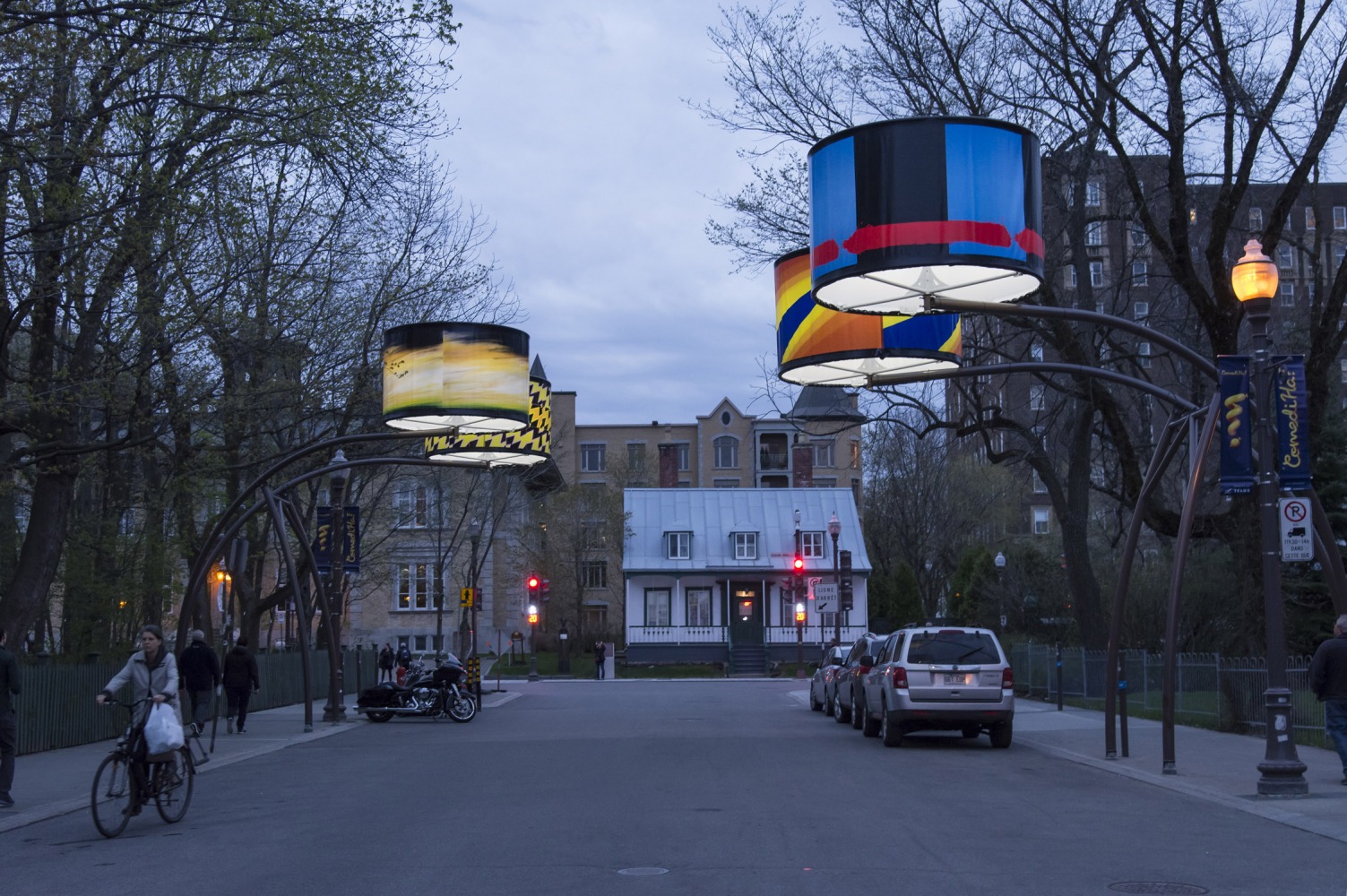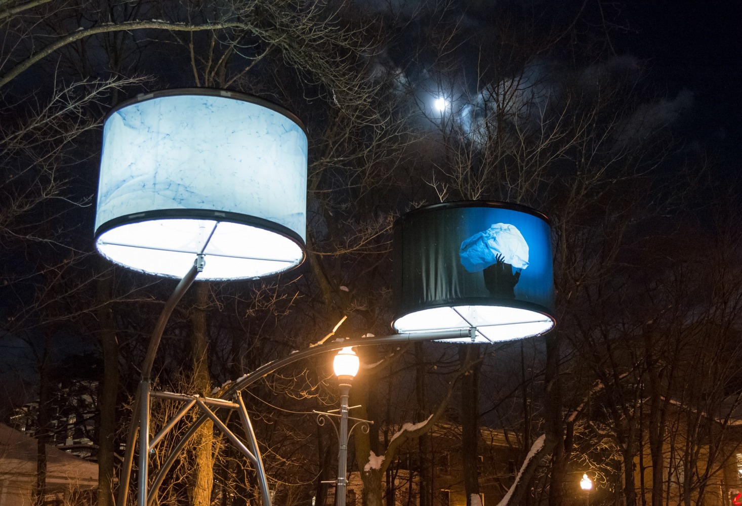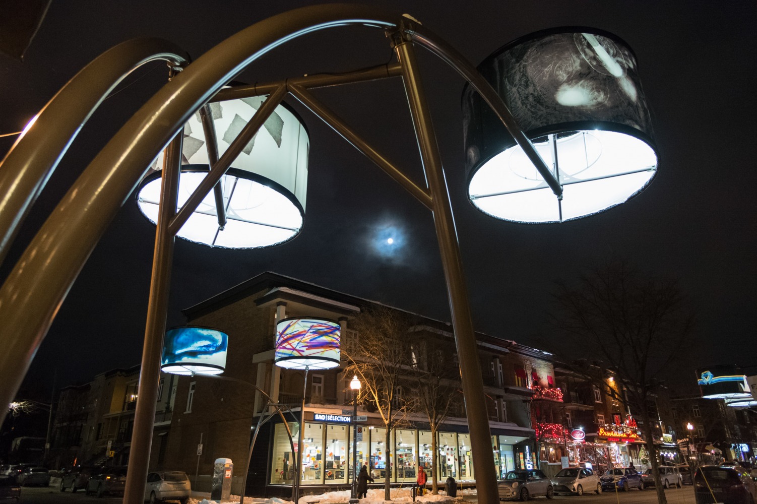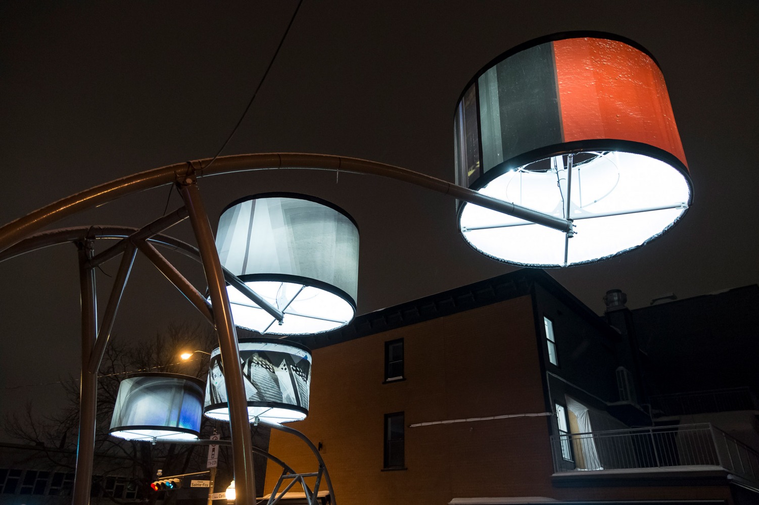Manon de Pauw, professeure à l’école des arts visuels et médiatiques, signe l’édition 2018-2019 de Lumière sur l’art en créant 34 œuvres inédites pour l’occasion. L’artiste s’est amusée avec ce concept unique plus grand que nature : «J’ai abordé Lumière sur l’art comme un jeu sur la lumière, la matière, la forme et la couleur, une exploration sur la temporalité et la circularité des images, toujours en considérant le point de vue des passants, explique-t-elle. Les abat-jours sont à la fois des objets utilitaires et des supports artistiques, allumés le soir et éteints le jour. Ces dualités m’ont interpellée dans ma manière de concevoir le parcours.»
