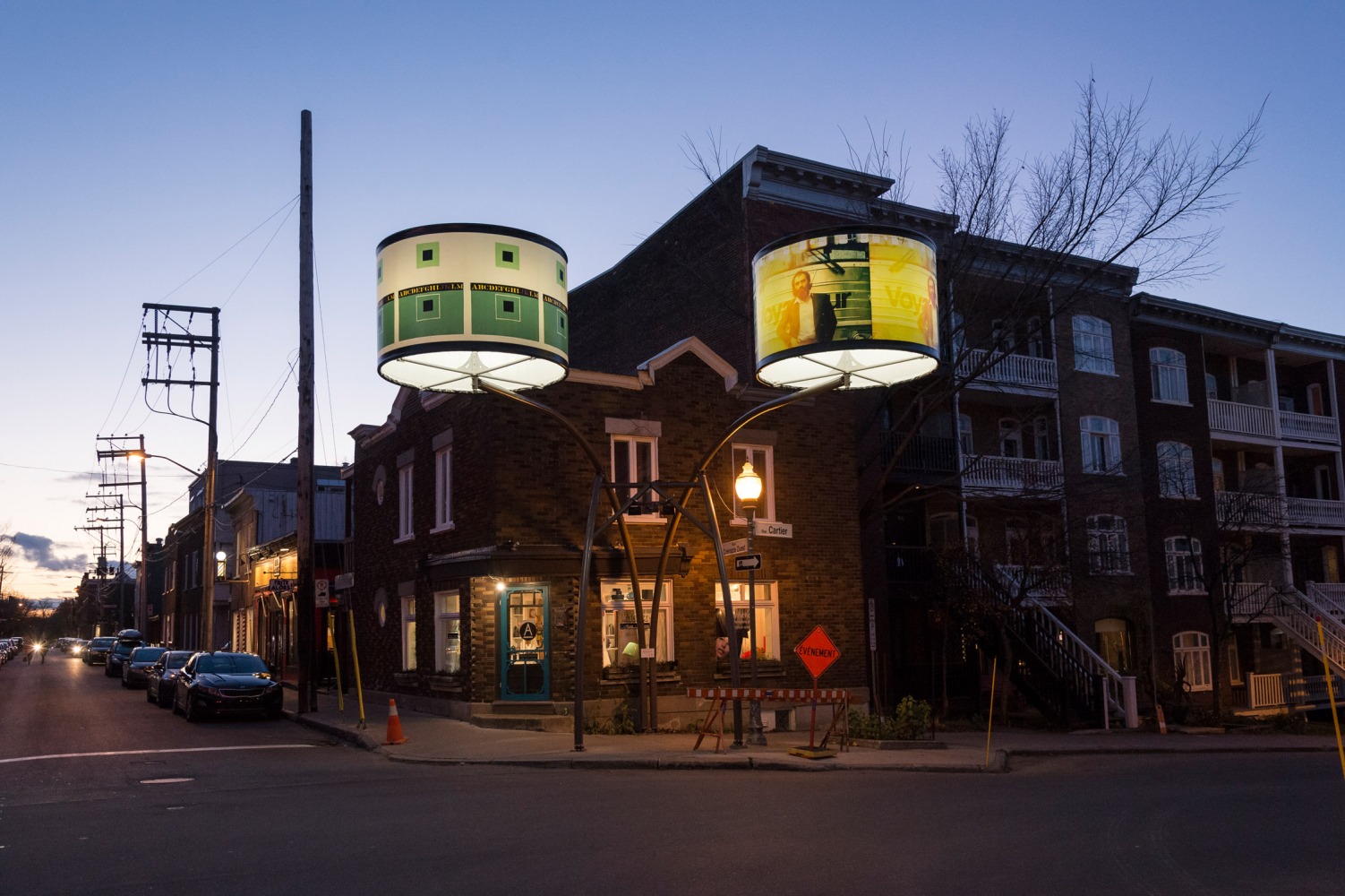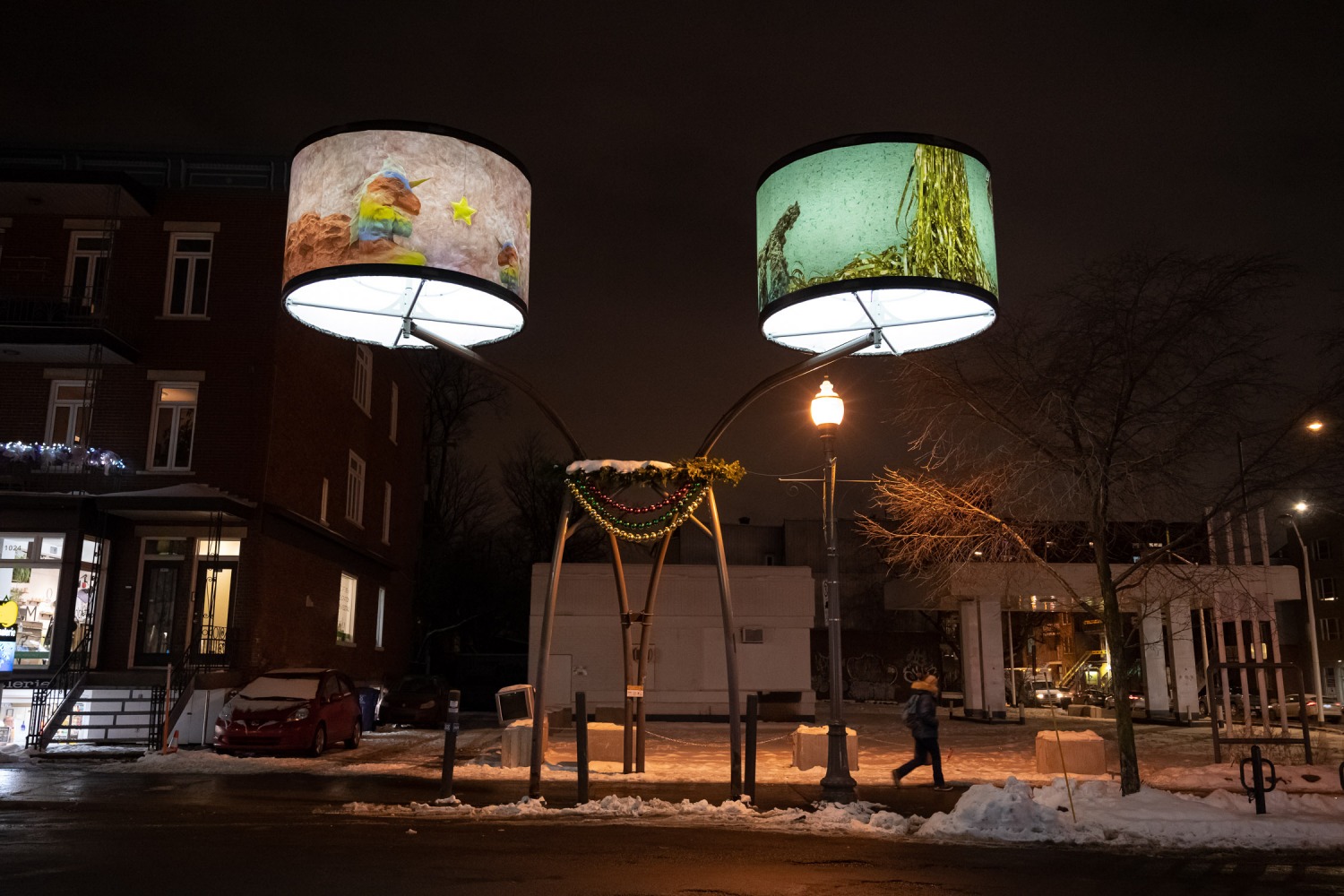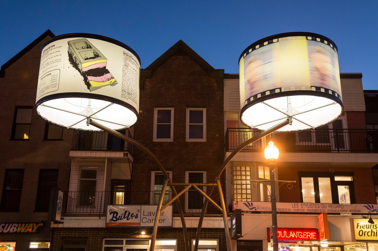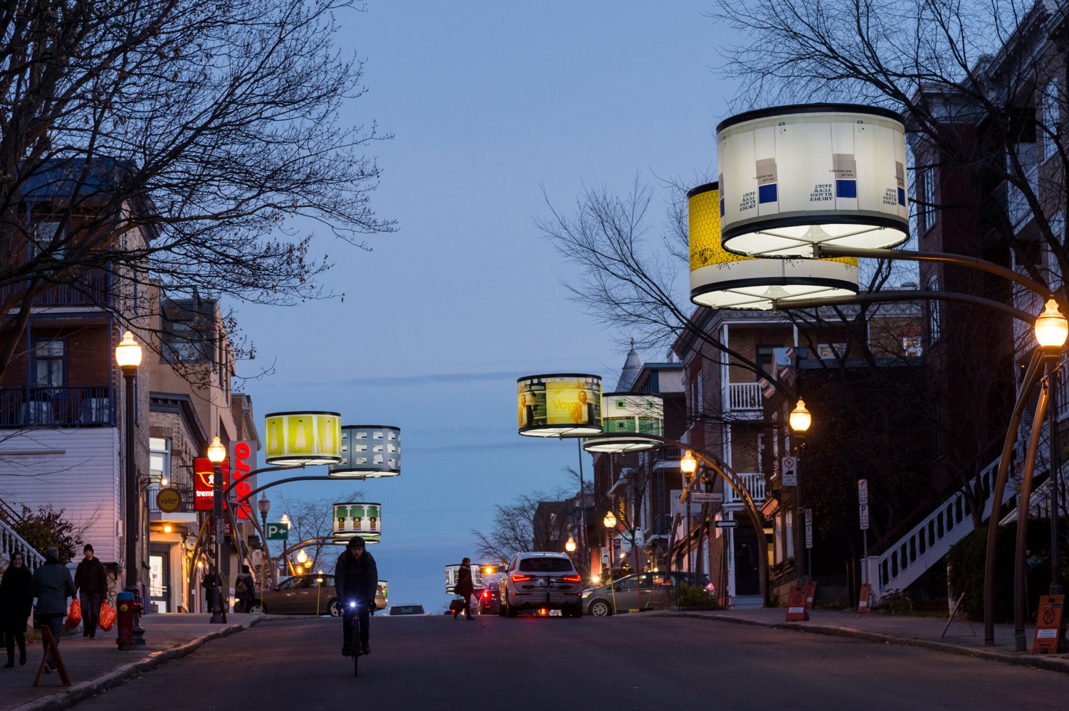 Manon de Pauw, professeure à l’école des arts visuels et médiatiques, signe l’édition 2018-2019 de Lumière sur l’art en créant 34 œuvres inédites pour l’occasion. L’artiste s’est amusée avec ce concept unique plus grand que nature : «J’ai abordé Lumière sur l’art comme un jeu sur la lumière, la matière, la forme et la couleur, une exploration sur la temporalité et la circularité des images, toujours en considérant le point de vue des passants, explique-t-elle. Les abat-jours sont à la fois des objets utilitaires et des supports artistiques, allumés le soir et éteints le jour. Ces dualités m’ont interpellée dans ma manière de concevoir le parcours.»